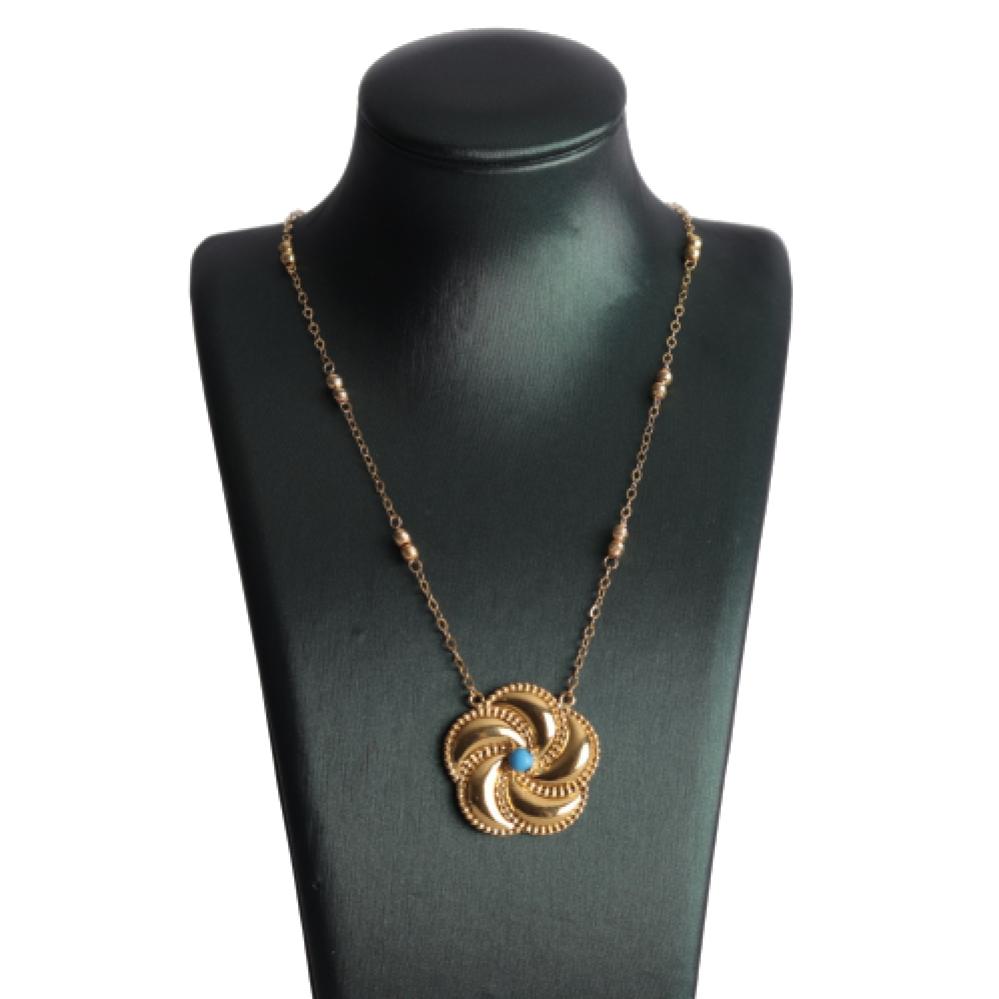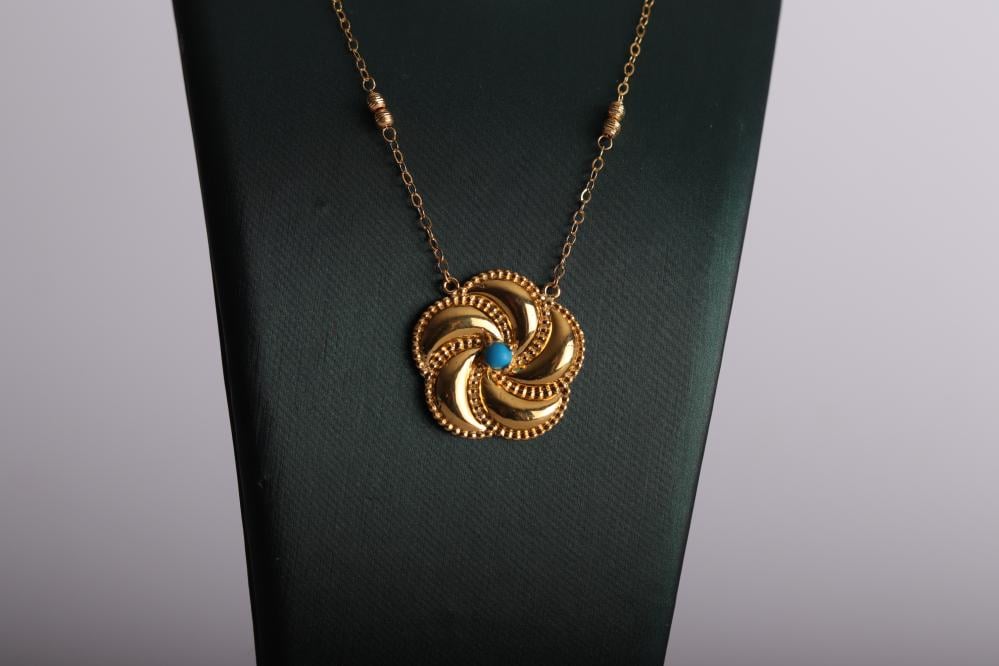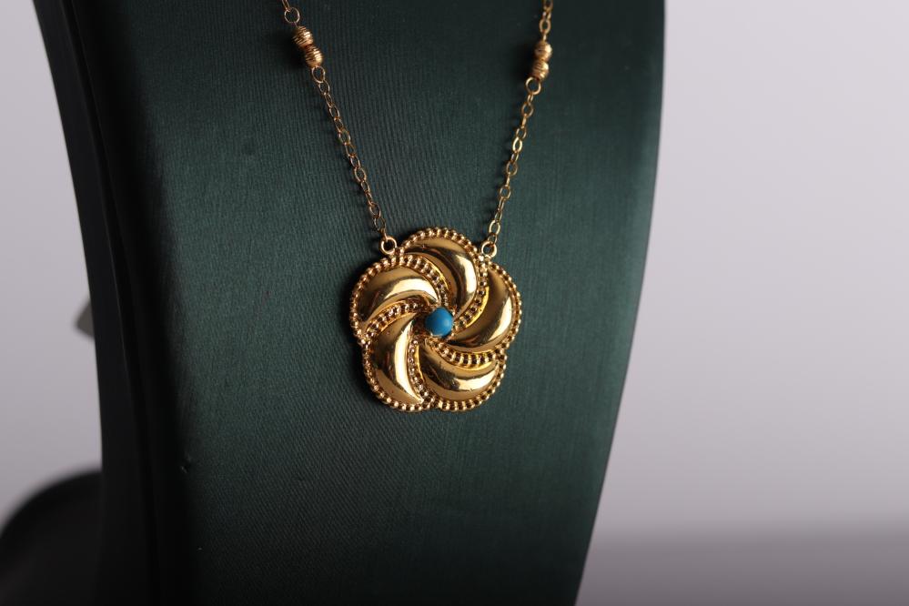 عقد زهرة الدوّامة عيار 21 بتصميم أنثوي فاخر يجمع بين الأناقة الكلاسيكية ولمسة العصرية ليضفي بريقاً ساحراً على إطلالتك