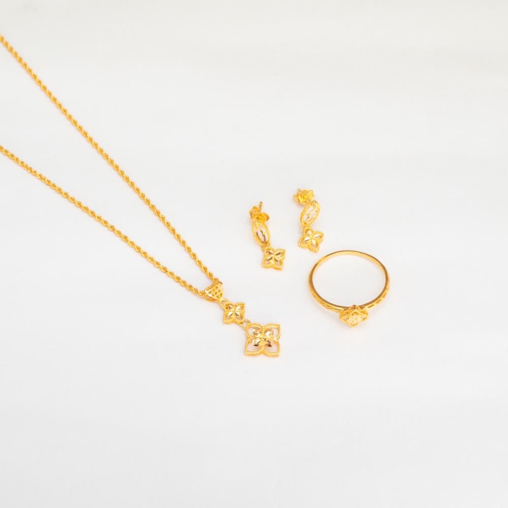 نصف طقم زهرة الأناقة المصنوع من ذهب عيار 21 بتصميم أنثوي فاخر ولمسات زخرفية تعكس الرقي والجمال. يزن 4.86 جرامًا، ويضم قلادة، أقراط، وخاتم بتصميم زهري أنيق يناسب جميع المناسبات.
