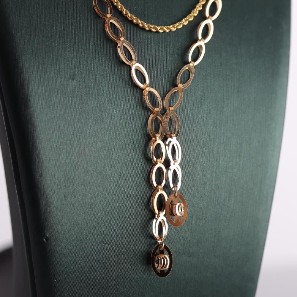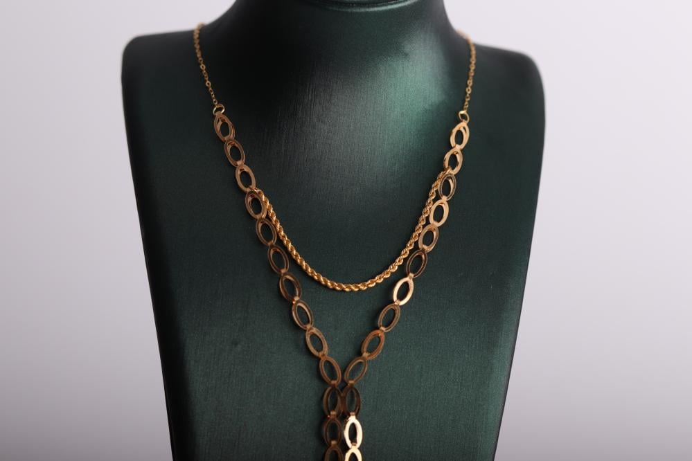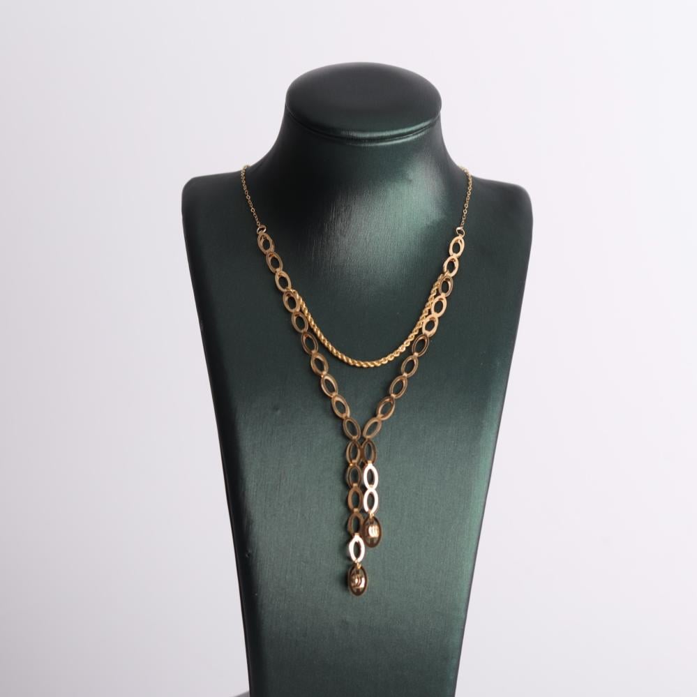 عقد ذهب عيار 21 بتصميم ناعم متداخل كزهرة تدور بلمعة فاخرة تضيف لإطلالتك سحر الأنوثة والرقي
